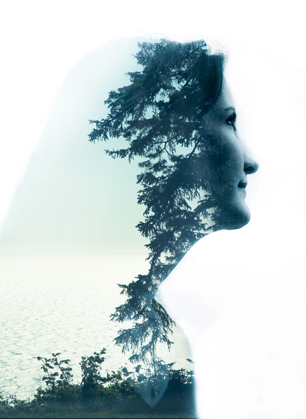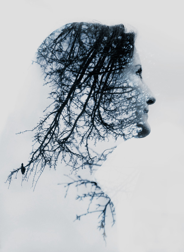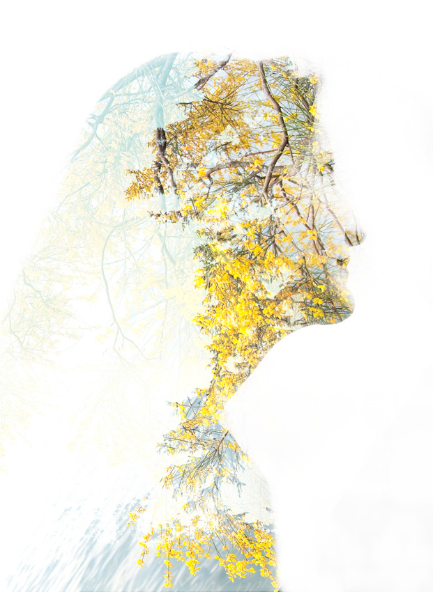 Da diese Funktion leider nicht bei meiner Kamera möglich ist, dachte ich mir, ich kann das genauso ausserhalb der Kamera komponieren mittels Photoshop. Das Portraitmotiv habe ich in Hinblick auf den geplanten Effekt als Silhouette gegen einen hellen Himmel fotografiert und dann in meinem Archiv nach geeigneten „Füllbildern“ gesucht. Ich fand diesen Baum und durch die Drehung ergibt sich sogar der Eindruck von Haaren.